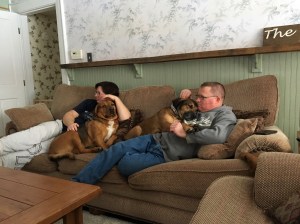 The sleeping arrangements were funny. We offered the bed to whomever wanted it. But they all refused, of course. So Kyler and I slept on our bed, in our empty bedroom, Mom and Tom slept in one bedroom on the air mattress and Grandpa slept on the floor/in Kyler’s chair! And the dogs visited each person throughout the whole night.